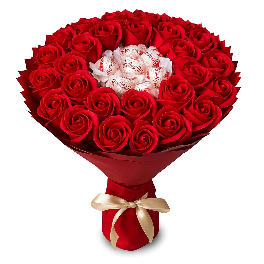 Ekskluzywny bukiet ze słodyczy Rafaello i róż mydlanych – elegancja w czekoladowym wydaniu