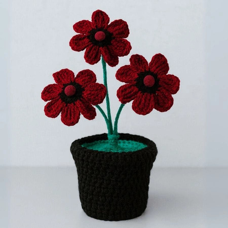 Podaruj bliskim niepowtarzalny bukiet szydełkowy w intensywnej, bordowej czerwieni, który wprowadzi do wnętrza nutę elegancji. Ręcznie robione kwiaty osadzone w czarnej, szydełkowej doniczce to stylowa dekoracja i idealny prezent na urodziny, Dzień Matki, Walentynki, rocznicę, parapetówkę czy imieniny. Ten ekologiczny bukiet nie wymaga podlewania, a jego ponadczasowy charakter sprawi, że będzie cieszył oko przez lata. Doskonały dla miłośników rękodzieła i oryginalnych ozdób wnętrz.